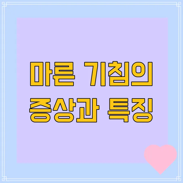 마른 기침의 특징으로는 몇 가지가 있습니다. 첫째, 기침의 강도가 종종 변화합니다. 가벼운 자극으로 시작해 점차 심해지는 경우가 많죠. 둘째, 기침이 발생할 때 지속적인 통증이나 화끈거림이 동반되기도 하며, 이로 인해 수면의 질도 저하될 수 있습니다. (한 연구에 따르면, 약 60%의 마른 기침 환자가 수면에 방해를 받고 있다고 하네요!) 셋째, 마른 기침은 대개 주변 환경의 변화, 예를 들어 건조한 공기, 흡연, 꽃가루 등의 자극에 의해 더욱 심해질 수 있습니다. 🌬️