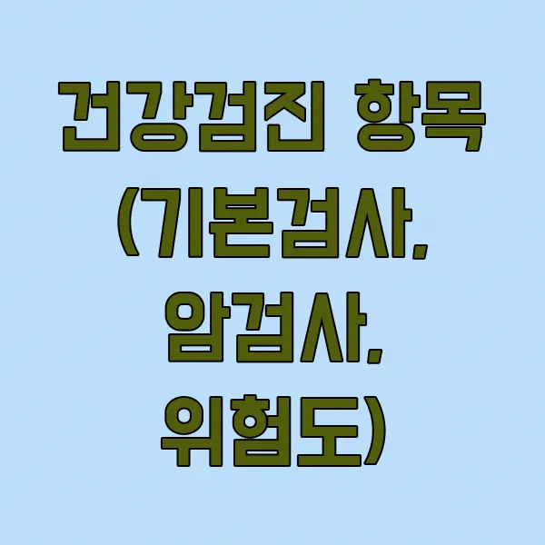 | 기본검사 | 신체 계측 (키, 몸무게, 허리둘레), 혈압, 시력, 청력, 소변 검사 (요당, 요단백), 혈액 검사 (간, 신장, 빈혈, 당뇨, 고지혈증), 흉부 X-ray 등 전반적인 신체 기능 및 건강 상태 확인. 만 20세 이상 2년 주기 (국민건강보험공단). |