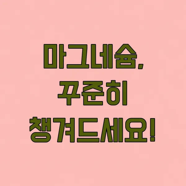 마그네슘은 우리 몸의 필수 영양소인 만큼, 꾸준히 섭취하는 것이 중요해요. 처음에는 효과가 바로 나타나지 않을 수 있지만, 꾸준히 챙겨 먹다 보면 어느새 몸이 편안해진 것을 느끼실 거예요.