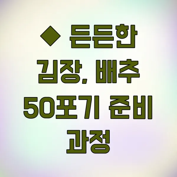 우선 속이 꽉 차고 크기가 균일한 배추 50포기를 고르는 게 첫걸음이랍니다. 좋은 배추를 골라야 김장 맛도 제대로 나오잖아요. 굵은 소금을 넉넉하게 사용해 배추 사이사이에 꼼꼼하게 뿌려 절이는 과정이 필요해요. 보통 50포기 기준 굵은 소금은 20kg 정도 잡아야 충분하더라고요. 12시간에서 15시간 정도 절인 후, 중간에 한두 번 뒤집어 주는 센스를 발휘해야죠.